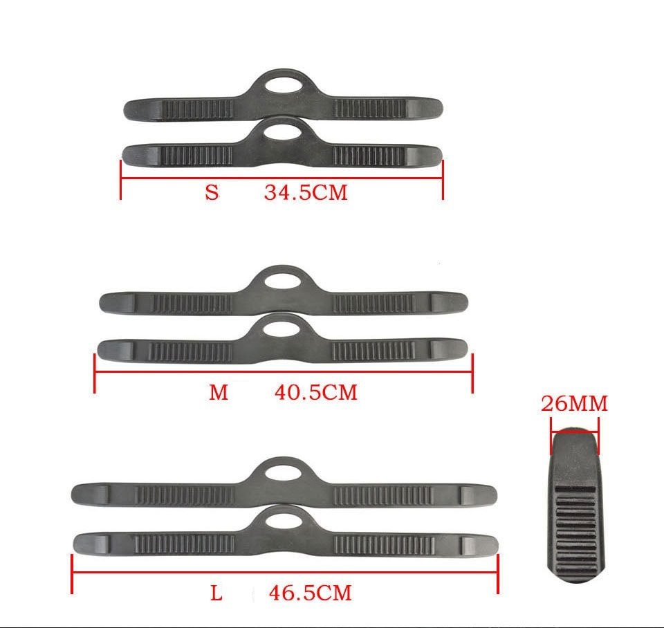 Ремешки с пряжками для ласт с открытой пяткой. В комплекте 2 шт. Размеры: S — 34,5 см M — 40,5 см L — 46,5 см Ширина 26 мм