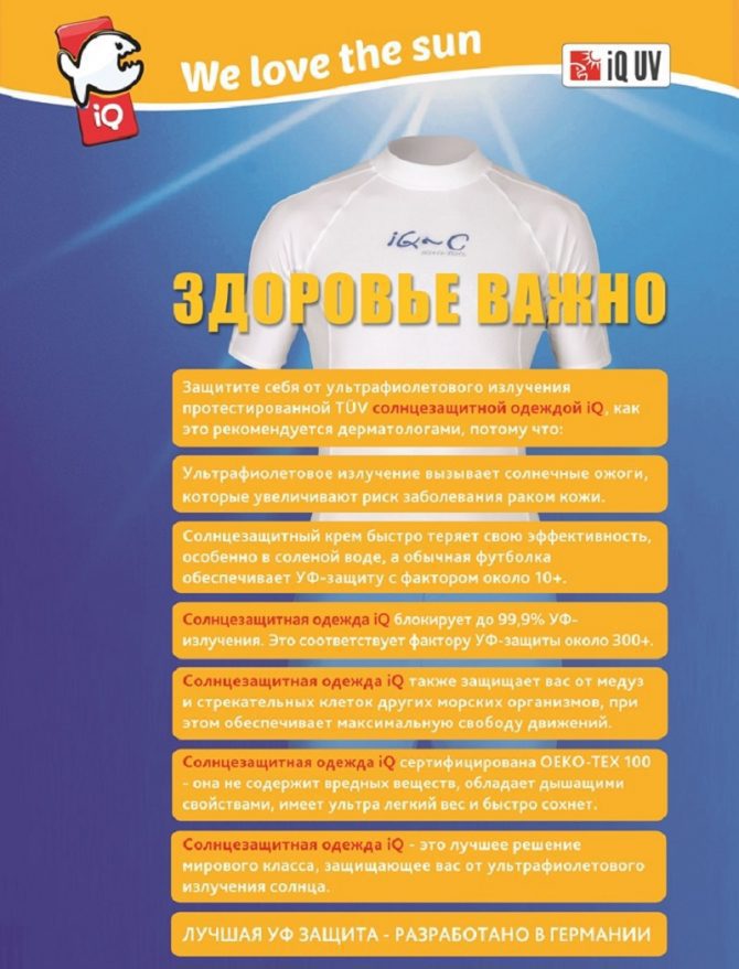 Комплект MiaCarlo, iQUV300+, футболка короткий рукав + шорты Предназначен для пляжного отдыха и плавания. Ультра высокая защита от УФ излучения. Материал: 80% полиамид и 20% эластан Свойства материала: Фактор защиты УФ 300+ позволяет в 300 раз дольше находиться на солнце, чем без защиты. Ультра легкий * Дышащий * Быстро сохнет * Прохладный на коже * Защищает от медуз * Сверх эластичный