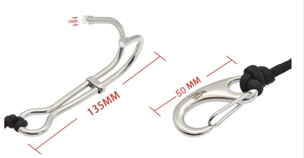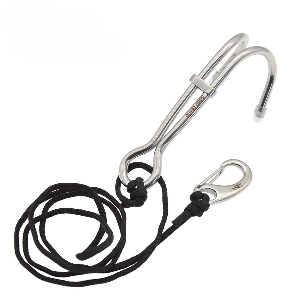 Рифовый крюк с карабином и линем даёт возможность дайверу закрепиться в одном месте в условиях сильного течения. Устройство особенно полезно подводным фотографам, которым нужны обе свободные руки для управления фотоаппаратом или видео камерой. Стальной рифовый крюк с желтым линем длиной 1 м. При выборе места фиксации крюка нужно быть осторожным, чтобы не повредить коралловый риф и не разрушить место обитания подводной живности. Наилучшим образом подходят расщелины и выпуклости рельефа без наличия живой растительности. Двойной стальной крюк 135мм Стальной карабин длиной 50мм Удерживающий линь длиной 100мм