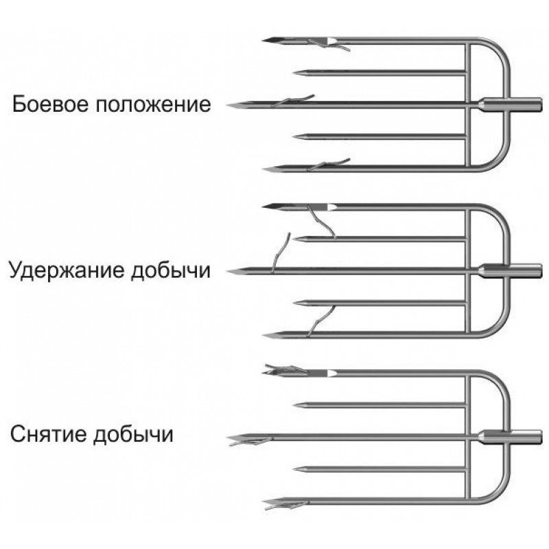 Пятизубец «»Каюк»» изготавливается под резьбу международного стандарта М7. Диаметр среднего и крайних зубов 6 мм. Диаметр промежуточных зубов 5 мм. Длина центрального зуба 200 мм. Расстояние от флажка до кончика зуба 35 мм. Расстояние по осям между крайними зубами 100 мм. Флажки выполнены из пружинной нержавеющей проволоки диаметром 2 мм. Остальные элементы изготовлены из упругой нержавеющей стали. Кончики среднего и крайних зубов выполнены трехгранными и имеют большую проникающую способность по сравнению с круглыми. В основном применяется при охоте на угря.Положение флажков во время выстрела, удержания и снятия смотрите на фото. Перед очередным заряжанием не забудьте вернуть флажки в исходное положение.Конструкция флажков патентована в России, Беларуси.