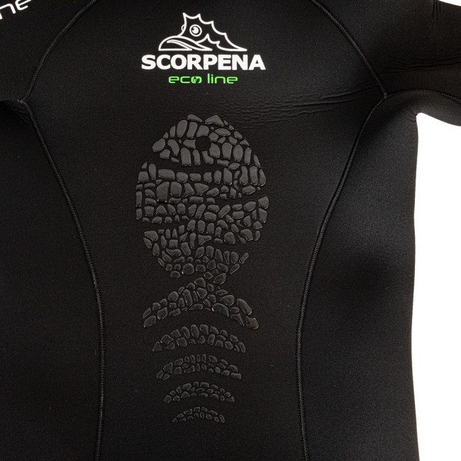 Scorpena EcoLine — то, чего у нас ещё не было! Совсем новый гидрокостюм. Что в нём уникального? Всё, от дизайна и материалов до технологии производства! Девизом этой модели можно назвать фразу: «»Просто скажи «да» экологически чистому неопрену»».Этот гидрокостюм создан из неопрена Sheico с использованием натурального сырья, некоторых вторичных материалов и применения экологических технологий. Мы любим окружающую среду, в которой мы живем, и пришло время внести свой вклад в её сохранение. Вот почему мы начинаем производство этих гидрокостюмов Scorpena. Причём по весьма демократичной цене. EcoLine — гидрокостюм, который производится по новой (для нас) экологичной технологии, на 30% эта модель состоит из сырья вторичной переработки. Несмотря на новизну и экологичность производства, этот костюм будет входить в относительно бюджетный сегмент нашей коллекции гидрокостюмов. Как мы уже говорили, эта модель будет производиться как в варианте с двойным нейлоновым покрытием (внутри и снаружи), так и с открытой порой внутри. Модели костюмов с открытой порой изнутри мы рекомендуем для тех подводных охотников, кто охотятся подолгу и которые чувствуют уверенность в своём опыте обращения с неопреновыми изделиями и знаниями об уходе за ними. А костюмы с нейлоновым покрытием изнутри предназначены для охотников которые не проводят по 5-6 часов под водой и те, кому приходится одеваться в морозную погоду или на пронизывающем ветру или облачаться сразу в лодке. Гидрокостюм SCORPENA EcoLine состоит из двух частей: комбинезона типа Long John (Лонг Джон) представляющего собой высокие штаны с лямками, а также куртки со встроенным шлемом. Выкройка гидрокостюма Scorpena EcoLine анатомическая, скроена по фигуре, с учетом анатомии российских охотников и состоит из 29 деталей. Все швы проклеены встык на автоматическом оборудовании компании Sheico и дополнительно прошиты мягким и тянущимся слепым швом нитками с повышенной устойчивостью к гниению. Кромки куртки и штанов обшиты по периметру лайкровой лентой, а рукава и штанины обработаны тянущимся швом «»оверлок»» для предотвращения отслаивания ткани от неопреновой пены. Особая наша гордость – анатомический встроенный шлем который садится как влитой на подавляющее большинство российских подводных охотников и максимально закрывает голову и шею. Широкий лицевой круговой обтюратор капюшона выполнен из гладкого неопрена изнутри, что не позволяет воде просачиваться внутрь и увеличивает комфорт использования. Манжеты на штанинах и лицевая манжета костюма Scorpena EcoLine выполнены чуть более тонкими для большей эластичности и имеет изнутри гладкое покрытие Glideskin для предотвращения проникновения воды под костюм. Застежка куртки – двойная клипса на нижнем запАхе типа «»бобровый хвост»». Кстати, этот запах усилен нейлоном с обоих сторон, чтобы уменьшить вероятность повреждения при снятии костюма. Колени Scorpena EcoLine дополнительно усилены износостойкой тканью типа Supratex. А поверх этого материала в области колен нанесено особое матовое покрытие в виде сложного рисунка, что делает костюм не только удобным в использовании, но и стильным внешне. Также высокий стиль костюма подчёркивает полиуретановый глянцевый рисунок в виде стилизованной фирменной рыбки на груди, который предотвращает проскальзывание упора ружья при заряжании, но при этом не стесня