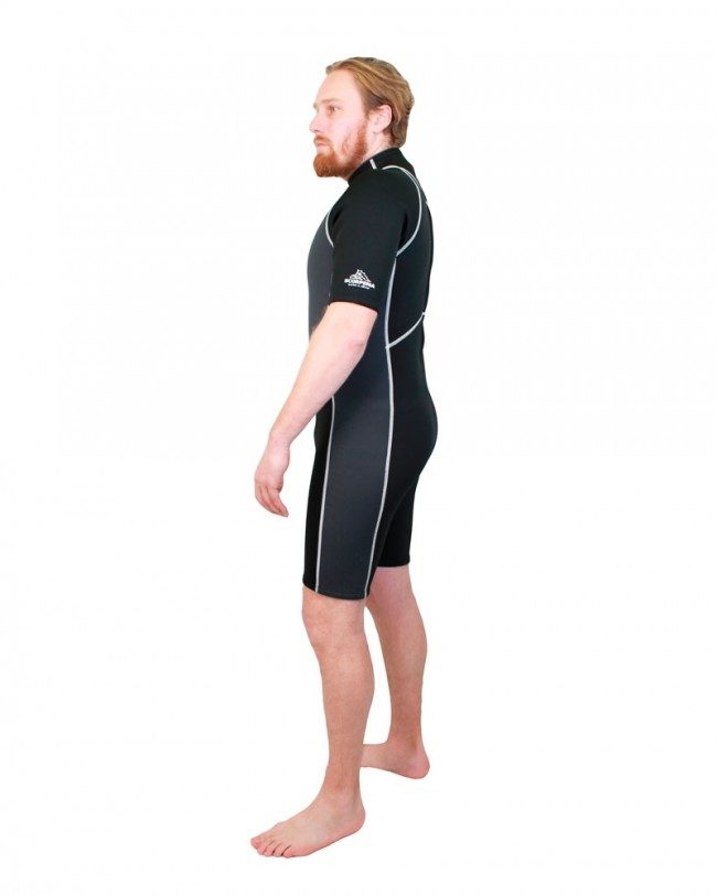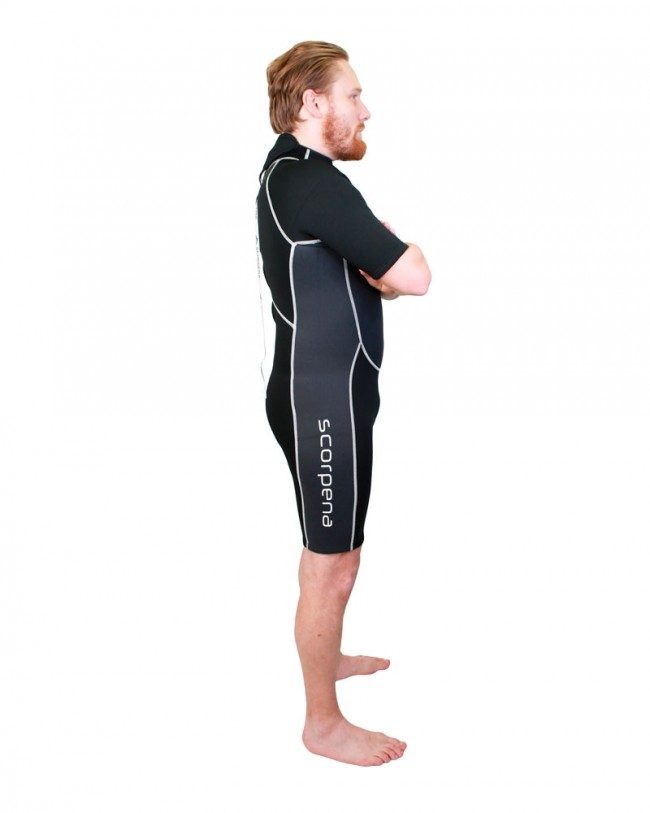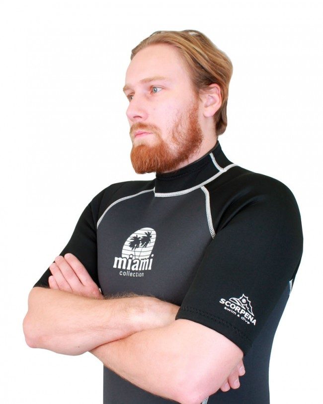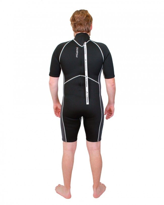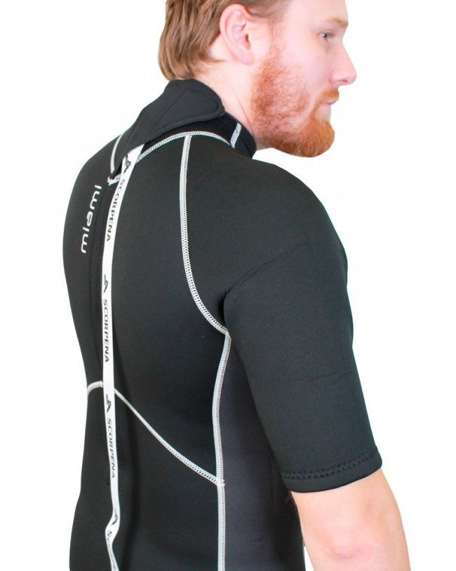 Основное назначение гидрокостюма Scorpena Miami-2 – защита тела человека от переохлаждения при его нахождении в воде. Ведь даже в условиях летнего отдыха, при плавании в тёплой воде, тело отдаёт тепло в 25 раз интенсивнее чем на воздухе. Поэтому использование неопренового гидрокостюма позволяет уменьшить теплопотери и продлить комфортное пребывание в воде. Также гидрокостюм препятствует облучению кожи человека ультрафиолетовыми лучами и позволяет избежать небольших травм от соприкосновений с подводными камнями, кораллами, медузами и пр. Из-за этого тонкие монокостюмы получили широкую популярность среди людей занимающихся активными видами отдыха и спорта на воде или простого плавания по поверхности с маской и трубкой. Практичные и стильные гидрокостюмы Scorpena Miami-2 предназначены для нерегулярных занятий любительским дайвингом или сноркелингом. Гидрокостюм Scorpena Miami-2 изготовлен из 3 мм неопрена с двухсторонним покрытием тканью. Чтобы ничего не натирало тела пловцов во время активных движений в воде, все швы на костюме выполнены плоскими. А для надёжности эти швы выполнены многониточными. Для удобства надевания гидрокостюм Scorpena Miami оснащён застёжкой-молнией проходящей вертикально по спине. Эта прочная молния с крупными зубчиками снабжена планкой изнутри — для уменьшения проникновения воды под костюм, а бегунок замка оснащён длинной фирменной петлёй Scorpena для облегчения застёгивания. Верхний мягкий клапан на липучке Velcro обеспечивает плотное прилегание воротничка к шее, а также фиксацию бегунка в застегнутом положении. По верхнему краю воротничка проходит так называемый Аквастоп — мягкая манжета из неопрена со специальным покрытием — для предотвращения затекания воды по шее внутрь костюма. Основной цвет костюма выдержан в прагматичных темных тонах стройнящих фигуру на которую он надет.