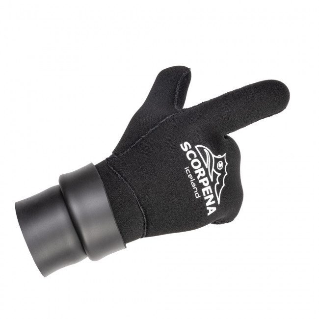 SCORPENA Iceland — трёхпалые рукавицы с двойной манжетой, предназначенные для плавания в очень холодной воде при подводной охоте, дайвинге, фридайвинге и занятиями другими видами водного спорта совместно с неопреновыми гидрокостюмами. Расположение в рукавице вместе трёх пальцев руки существенно сокращает теплопотери по сравнению с пятипалой перчаткой, а это значительно увеличивает тепловой комфорт и, как следствие, время пребывания под водой. Выкройка рукавиц SCORPENA Iceland создавалась с учетом анатомических особенностей строения правой и левой рук, а также учитывает наиболее естественное полусогнутое положение кисти руки в расслабленном состоянии. Это уменьшает нагрузку на мышцы и также продлевает время комфортного плавания. Рукавицы SCORPENA Iceland изготовлены из мягкого и эластичного неопрена фирмы SHEICO, склеены новейшим неопреновым клеем на водной основе (без химического растворителя). Затем ткань сшита «слепым» швом (игла не пробивает неопрен насквозь, а только сшивает внешнюю ткань), что препятствует проникновению воды через швы. Ладонь и пальцы покрыта стойким к истиранию и порезам материалом типа supratex, что позволяет не боятся случайных повреждений при ежедневной эксплуатации. Тыльная сторона ладони покрыта прочным нейлоном. Эти рукавицы оснащены двойной манжетой с внутренним покрытием типа smoothskin для использования с манжетами рукавов гидрокостюма с «открытой порой» или гладким покрытием изнутри. Нижняя манжета заправляется под рукав, верхняя манжета располагается сверху рукава. В результате такого сочетания покрытий рукавицы и костюма на их стыке образуется гидрозамок лабиринтного типа, и попадание воды внутрь через такое уплотнение практически исключается. Максимальный изолирующий эффект достигается при использовании гидрокостюмов, оснащённых двойными манжетами на рукавах. Но нужно помнить, что для правильного надевания рукавиц такого типа желательна помощь напарника, особенно в первое время. Основная толщина рукавиц — 7 мм. Размеры от XS до XXL.