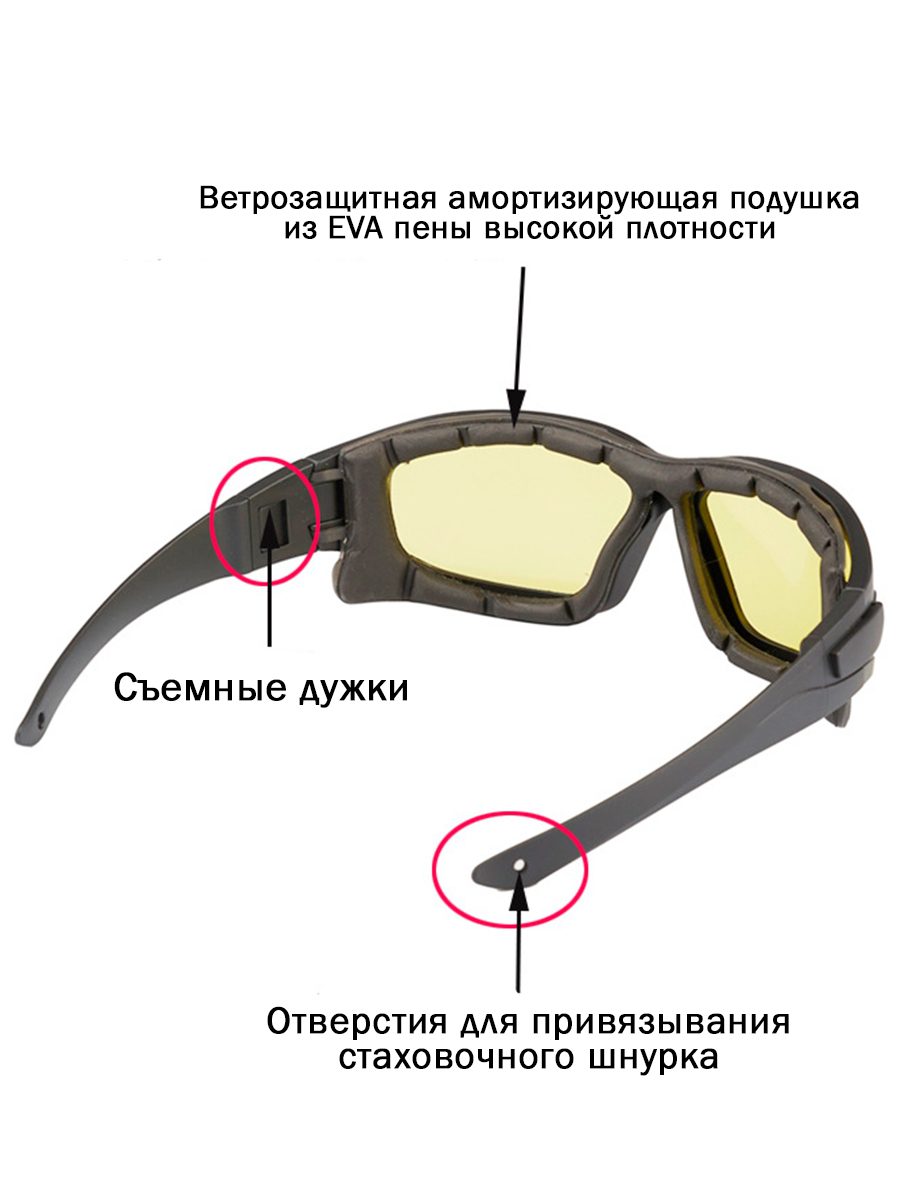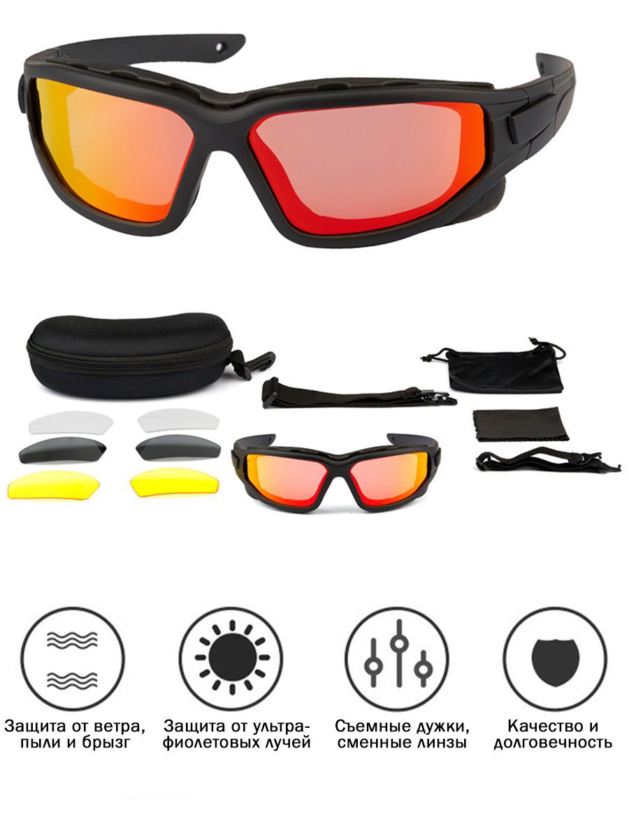 Очки для кайтсерфинга, вейкбордига, катания на гидроцикле, лодки, лыжах и многого другого — соответствуют всем современным функциональным требованиям защиты и безопасности, являясь в то же время модным спортивным аксессуаром, подчеркивая стиль и имидж их владельца! Это очки с исключительными защитными свойствами, лучшими линзами в мире и хорошо продуманной безопасной системой страховки! Инновационные особенности и технологии позволяют надежно защищать глаза и повышать комфорт зрения, передавая ощущение уникальности от приобретенного продукта! Универсальные мультиспортивные очки — это очки трансформеры! Их можно использовать, как модные солнцезащитные пляжные, или уличные очки. Для использования на воде, чтобы их не потерять достаточно всего на всего пристегнуть эластичную резинку (удерживающий ремень-strap) в особое технологичное отверстие на окончаниях дужек или заменить дужки на эластичный регулируемый ремешок. А сменные линзы позволят использовать очки в любую погоду и время суток. Красная линза — уменьшает степень попадания света, но не влияет на четкость зрения. Подходит для езды на велосипеде, катания на лодке и гидроцикле, для рыбалки. Серая линза — подходит для всех видов спорта. Желтая линза — увеличивает контрастность и яркость, делает естественные цвета более четкими. Лучше всего использовать в сумерки, во время тумана, в дождливые дни. Прозрачная линза — основная функция защита глаза от посторонних предметов, ветра, комаров. Вес — 37г Комплектация: очки 4 пары сменных линз съемные дужки 2 эластичных ремешка тряпочка для протирки мешочек для хранения жесткий кофр с карабином